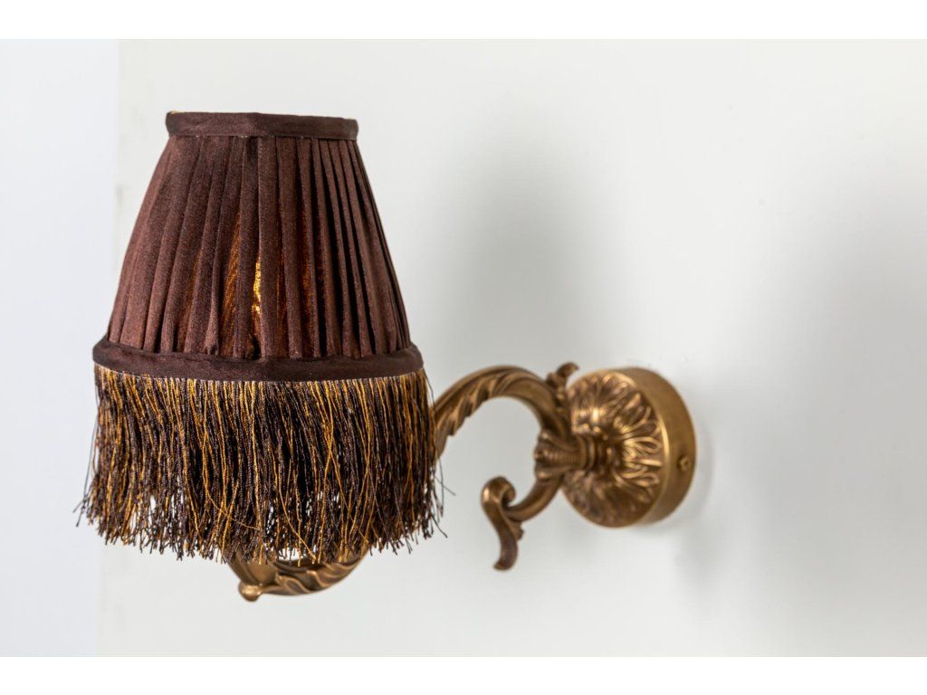 Vneste do svého interiéru atmosféru starých časů a hřejivé světlo. Tato nástěnná lampa (applique) je dokonalým spojením uměleckého kovářství a textilního designu. Elegantně tvarované bronzové rameno s jemným reliéfem nese klasické látkové stínidlo, které je ve spodní části zdobeno bohatými dvoubarevnými třásněmi.