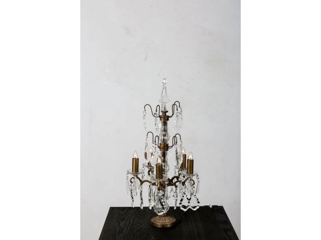 Centrální skleněný sloup je obklopen elegantně tvarovanými rameny, která nesou svítidla ve tvaru svící. Každý detail, od jemně tepané základny až po precizně broušené ověsy, svědčí o vysoké kvalitě řemeslného zpracování. Tato lampa není jen svítidlem, ale skutečným šperkem, který vynikne na krbové římse, masivní komodě nebo v reprezentační hale.