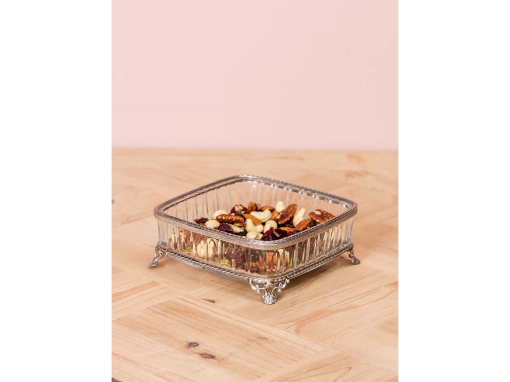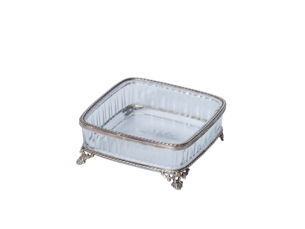 Malá skleněná dóza na zdobných, stříbrných nožičkách. Vhodná pro skladování surovin, šperků či jiných drobných předmětů.