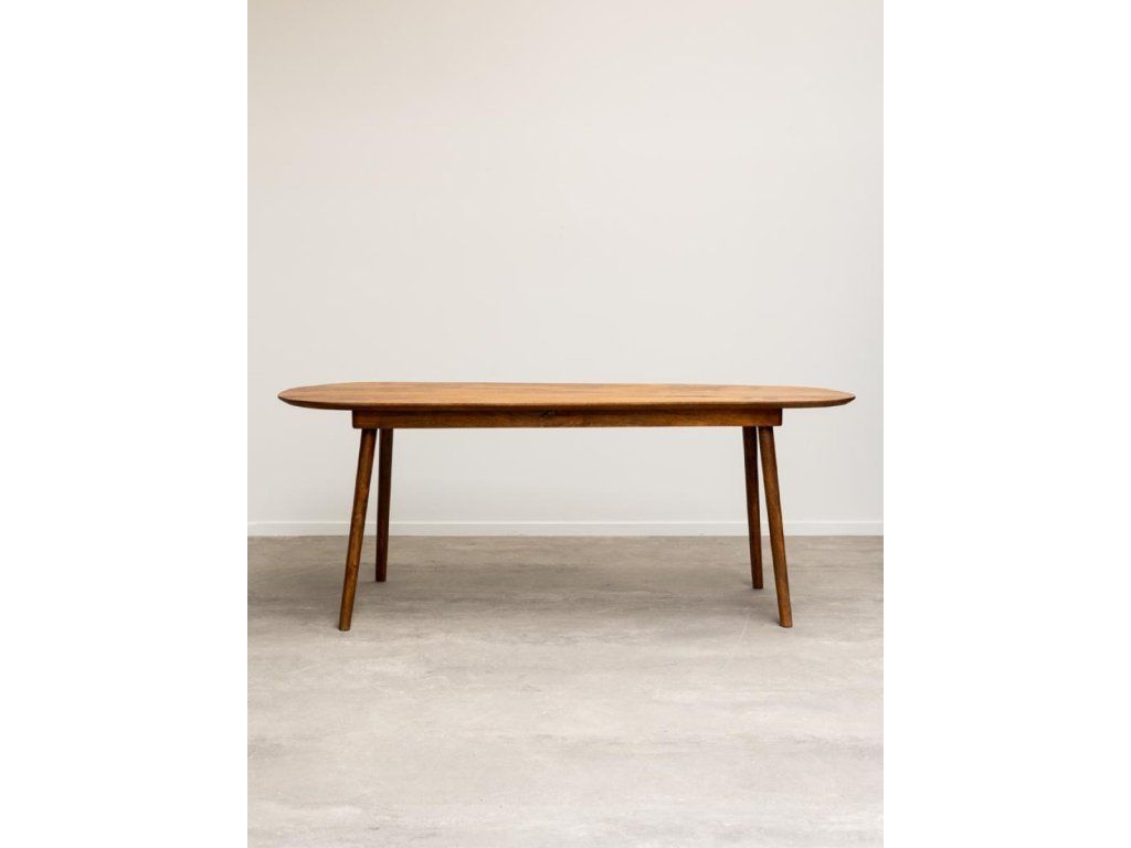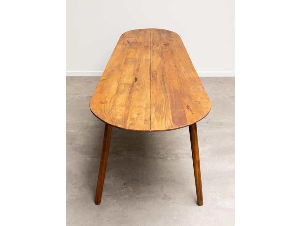 Designový dřevěný stůl od belgického návrháře. Horní deska ve tvaru asymetrického oválu dodává stolu nevšední podobu a dotvoří tak vyjímečnost Vačeho interiéru.